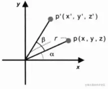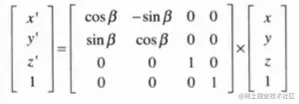 对于旋转可能会复杂一些,假设我们旋转角度为B,绕z轴旋转,计算过程就省略了,通过计算后会得到如下公式: