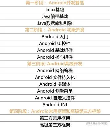 以上是要Android开发中要学习的大块知识点;学习笔记获取传送直达↓↓↓ :link.juejin.cn/?target=htt… 里面内容记录了Android开发必学的30多个技术板块。需要进阶自身可以参考查看。