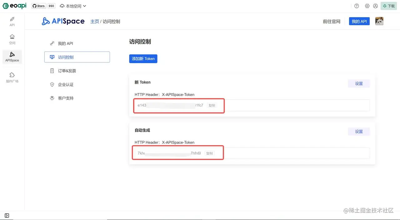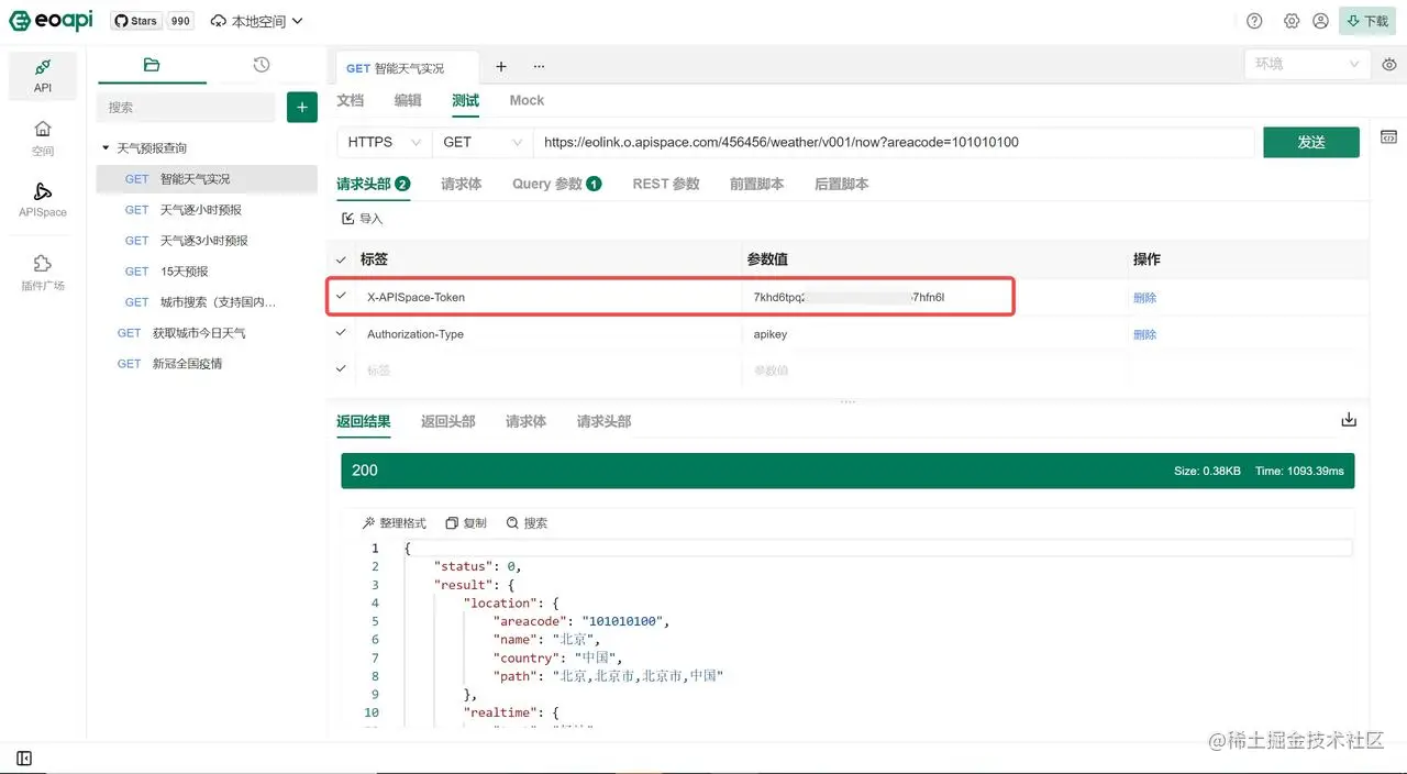 在 Eoapi 测试时,需要从【APISpace 控制台】 中复制【Token】 填入到 Eoapi 测试页面