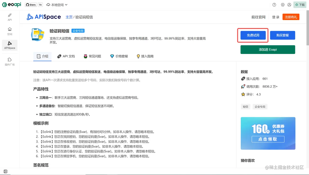 APISpace 是 Eolink 旗下专业的 API 开放与交易平台,为广大企业以及个人开发者提供多维度、全方位的 API 接口,覆盖短信验证、天气查询、快递物流、OCR 文字识别等海量 API 服务,帮助用户快速获取数据,降低获取数据的成本和难度,提升开发效率。