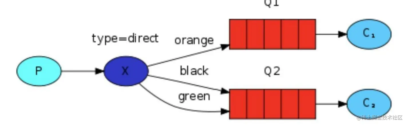 在上面这张图中,我们可以看到 X 绑定了两个队列,绑定类型是 direct。队列Q1 绑定键为 orange,