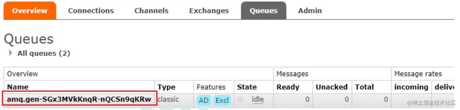 每当我们连接到 Rabbit 时,我们都需要一个全新的空队列,为此我们可以创建一个具有随机名称