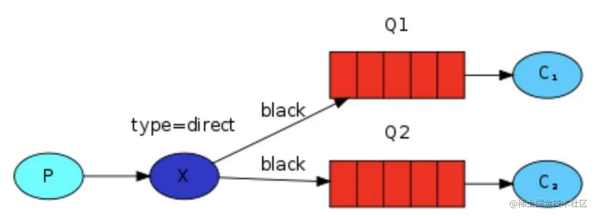 Q1。绑定键为 blackgreen 和的消息会被发布到队列 Q2,其他消息类型的消息将被丢弃。