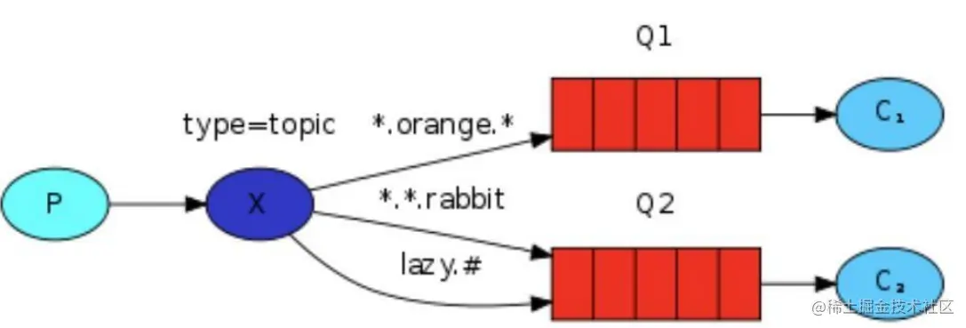 lazy.pink.rabbit 虽然满足两个绑定但只被队列 Q2 接收一次
