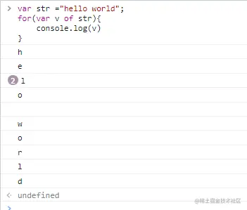 将上面的代码在浏览器的控制台中执行下就可以得到遍历字符串的结果: