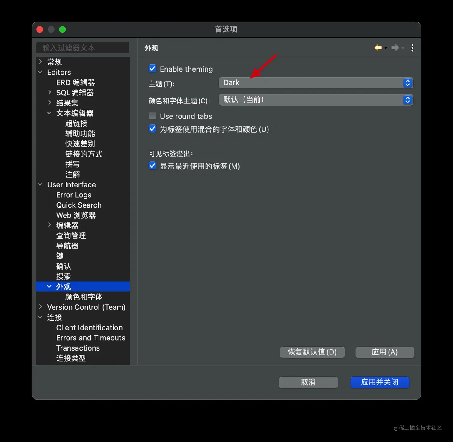 可以在首选项里对外观进行设置,比如说把主题修改为暗黑色。