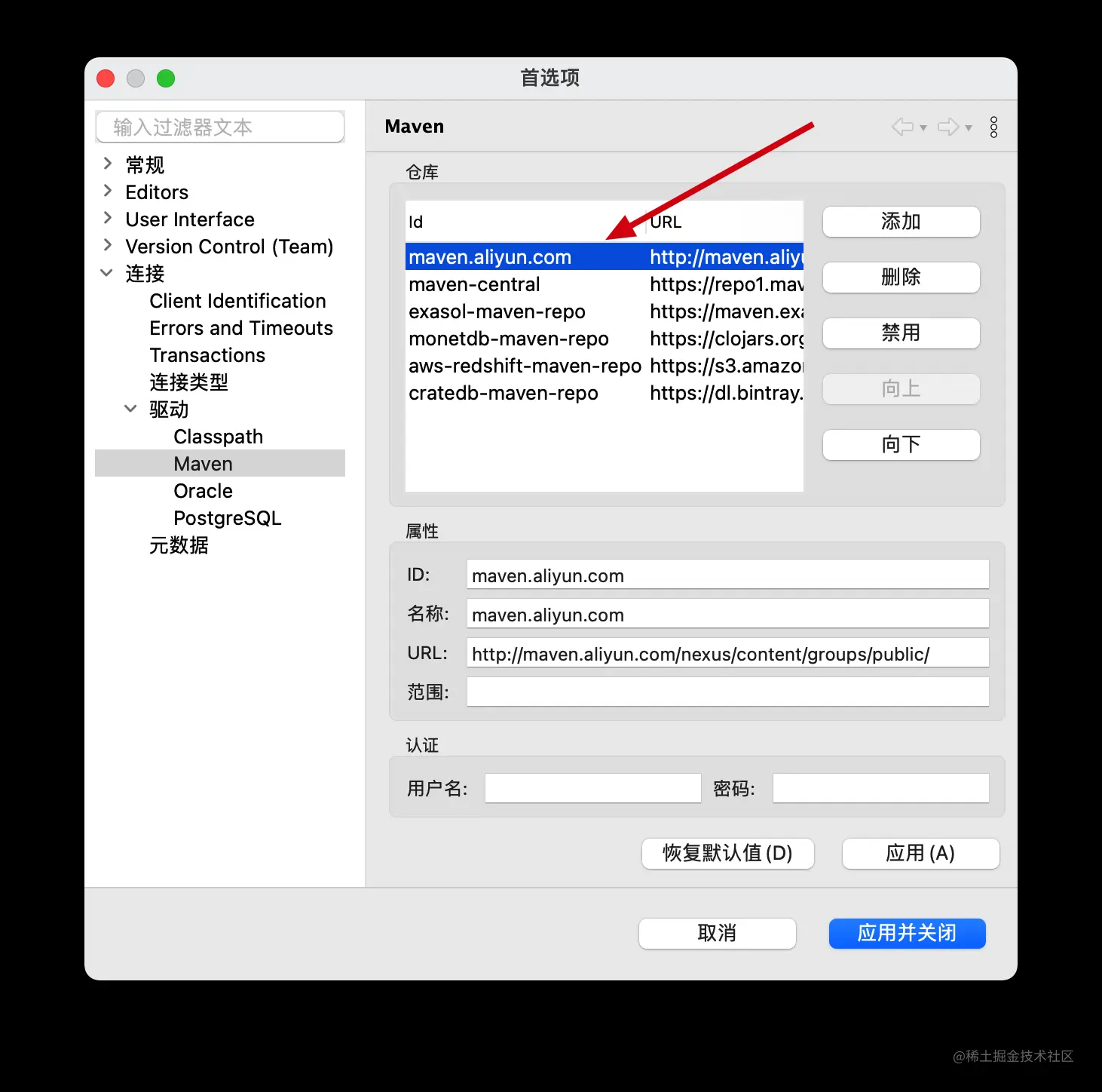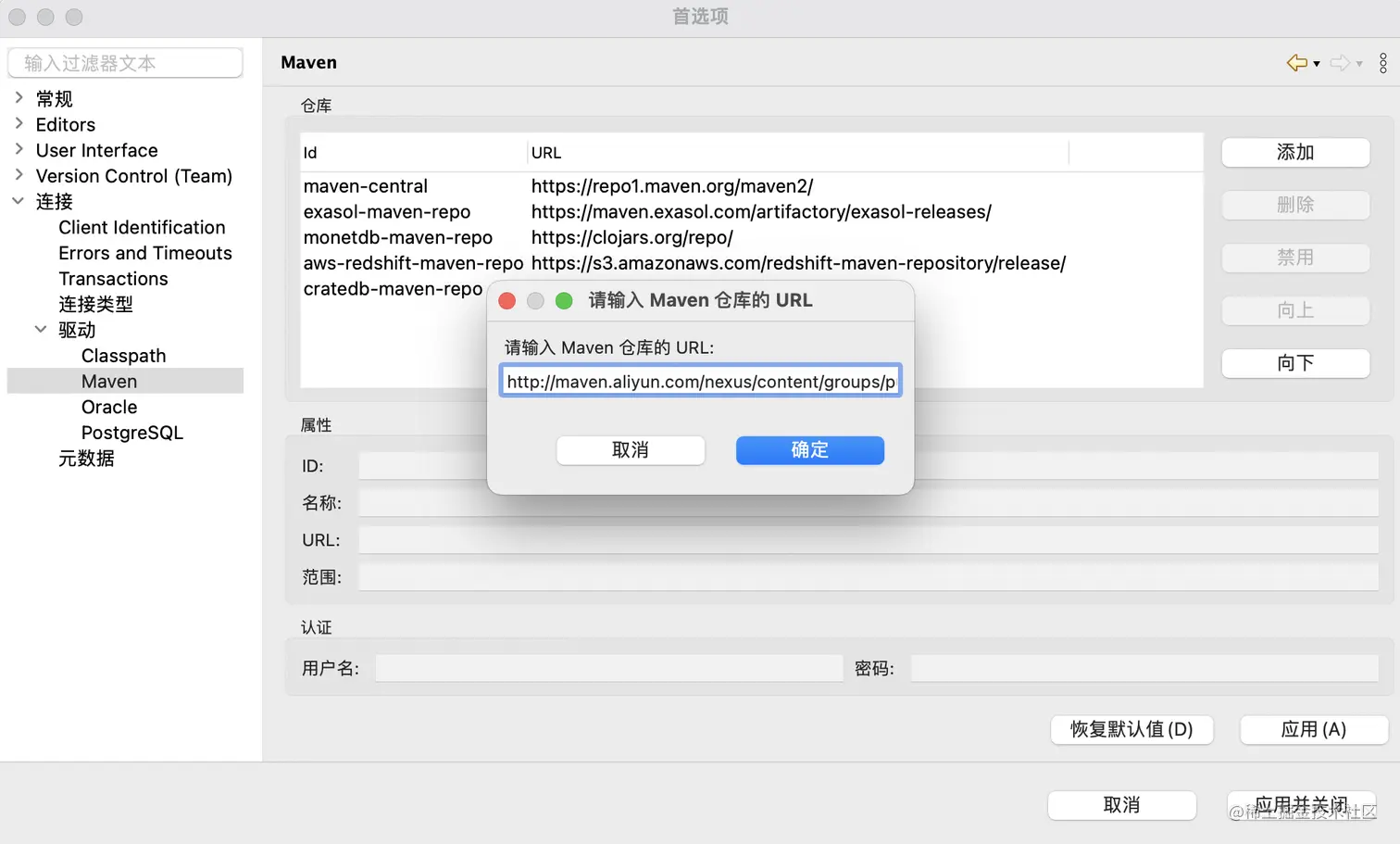 因为 DBeaver 是基于 Maven 构建的,数据库驱动也就是链接数据库的 JDBC 驱动是通过 Maven 仓库下载的。选择「首选项」→「Maven」,添加阿里云镜像地址: