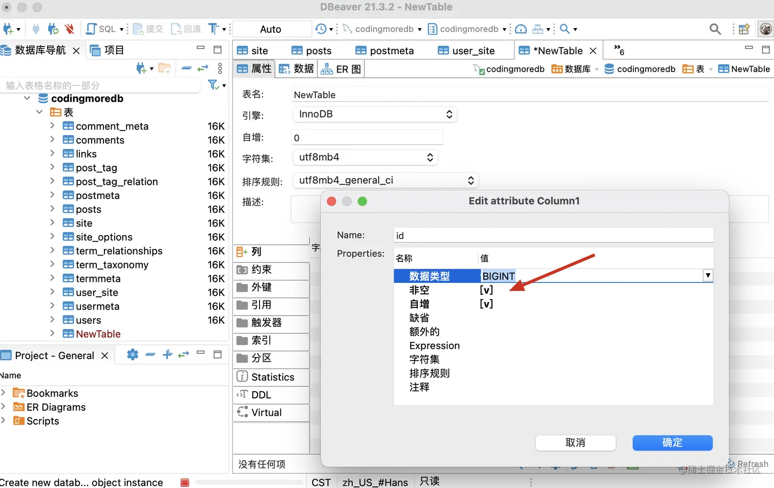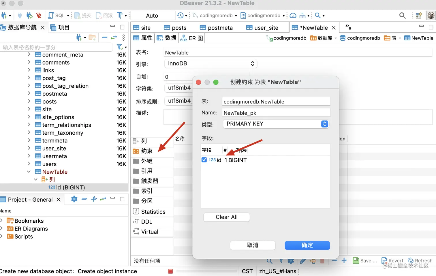 在 DBeaver 中,[v] 表示真,[] 表示否。紧接着在「约束」里选择 ID 将其设置为主键。