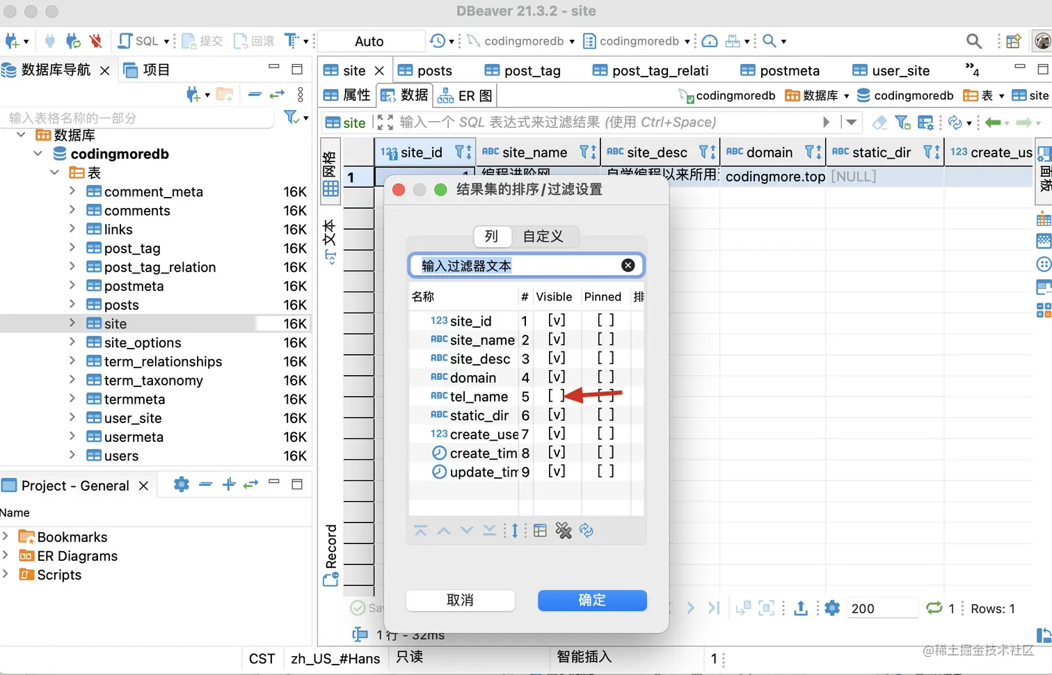 如果不想显示某一列的话,可以直接点击「自定义结果集」图表,将某个字段的状态设置为不可见即可。