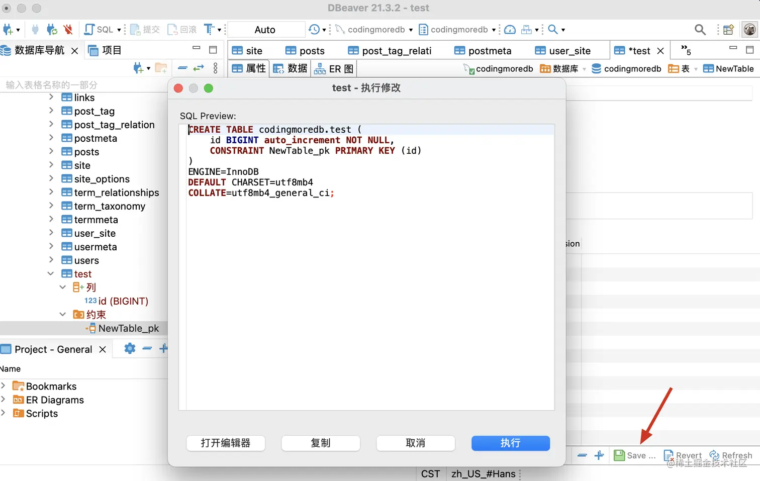 最后点击保存,会弹出一个建表语句的预览框,点击「执行」即可完成表的创建。