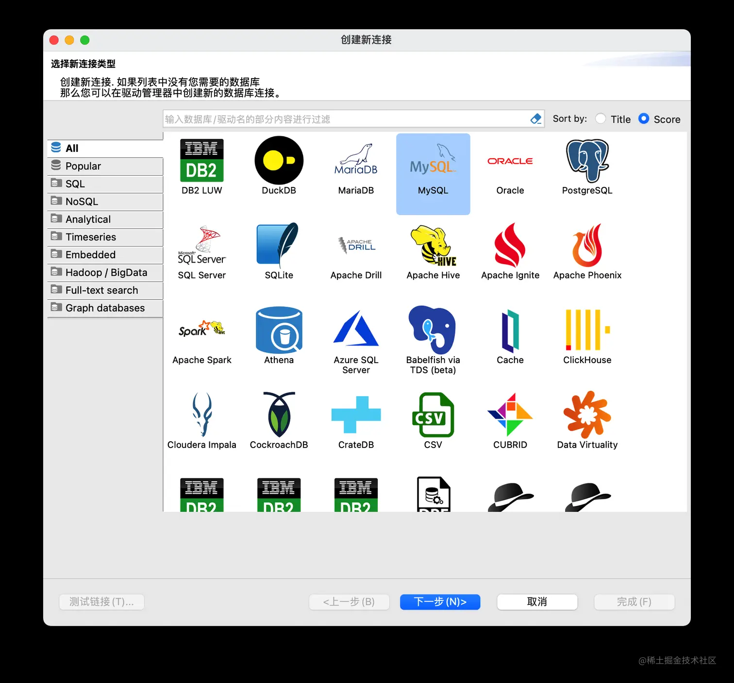 像使用 Navicat 一样,我们需要先建立连接,这里就以 MySQL 为例。点击「连接」小图标,选择数据库。
