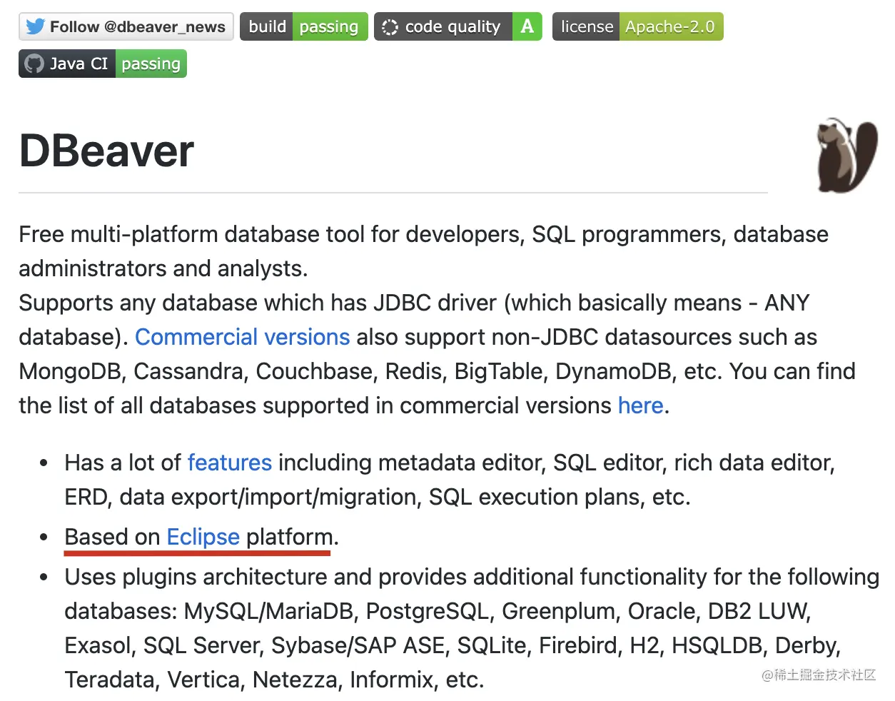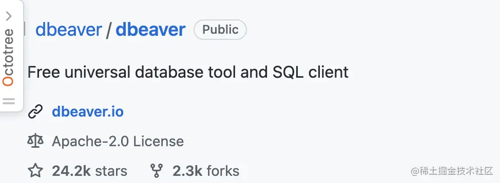 DBeaver 是由 Java 编写的,默认使用 JDK 11 进行编译。社区版基于 Apache-2.0 License 在 GitHub 上开源,目前已获得 24k+ 的星标。