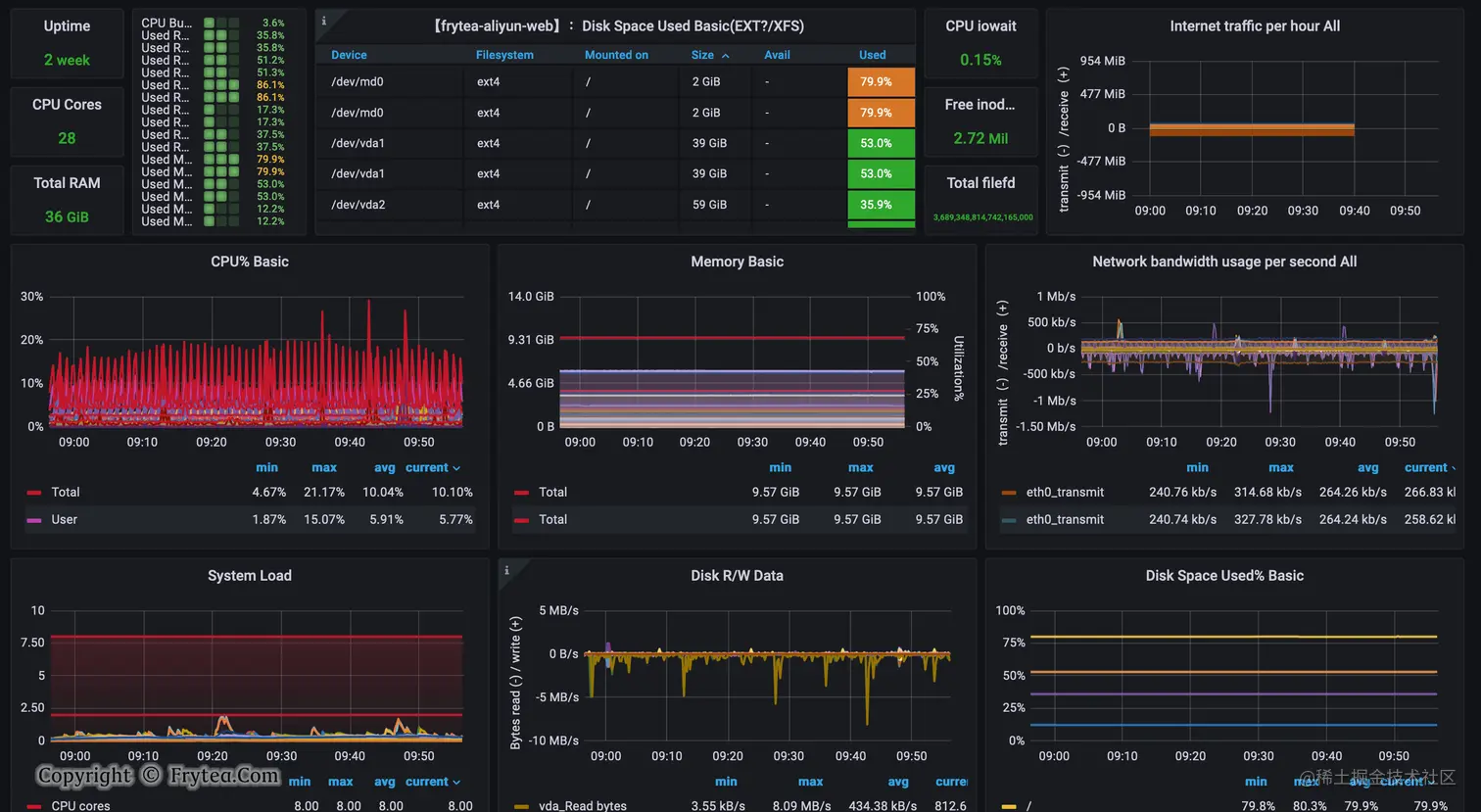 Prometheus 作为轮转数据库,从各个服务器采集数据; node-exporter 作为数据采集器,接受 prometheus 采集请求,上报主机各项参数; vadvisor 作为容器数据采集器,接受 prometheus 采集请求,上报主机 docker 各项参数; grafana 作为看板,从 prometheus 查询数据做数据可视化。