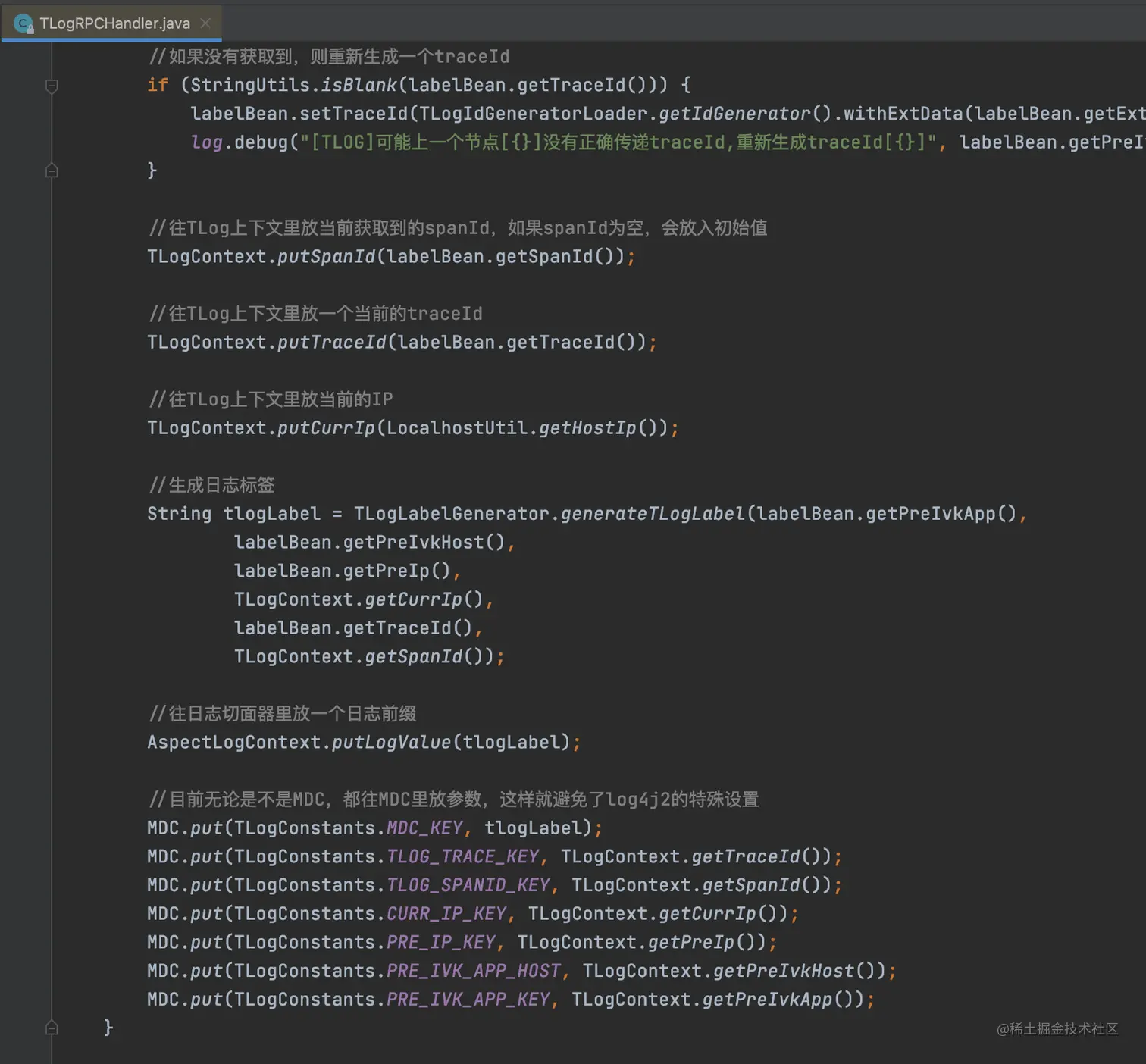 这个组件是用来处理调用方传递的traceId、preApp等信息,设置到TLogContext和MDC中,同时根据日志标签的格式生成日志标签。