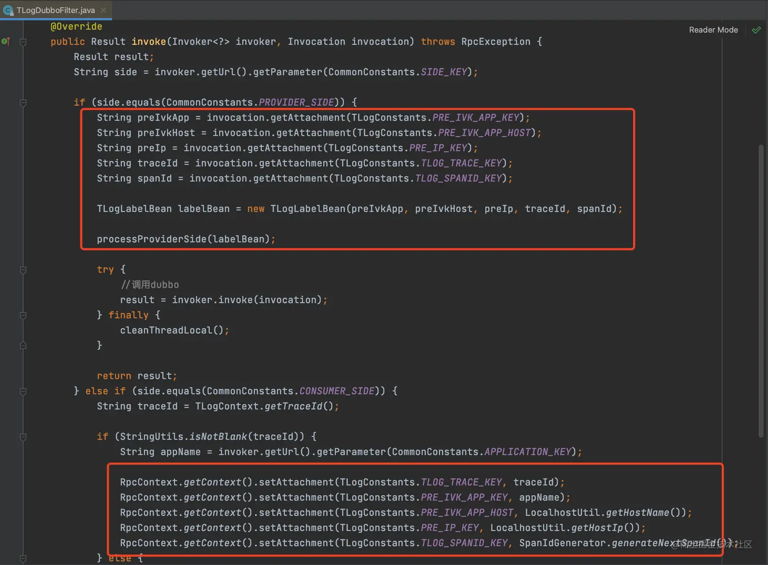 TLog通过SPI机制扩展Filter,在消费者发送请求前从TLogContext获取到traceId,然后将traceId和其它调用者数据设置请求数据中,服务提供者在处理请求的时候,也会经过Filter,从请求中获取到traceId等信息,然后设置到TLogContext中,从而实现了traceId在dubbo的消费者和提供者之间的传递。