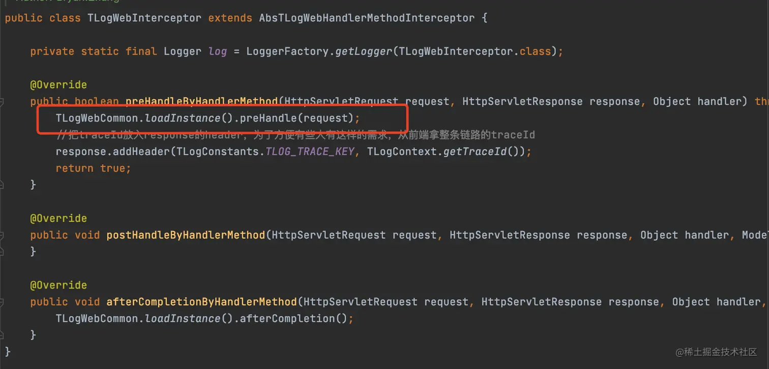 当被调用方接收到请求之后,会经过TLogWebInterceptor这个拦截器进行拦截,从请求头中获取到这些参数,设置到TLogContext中。