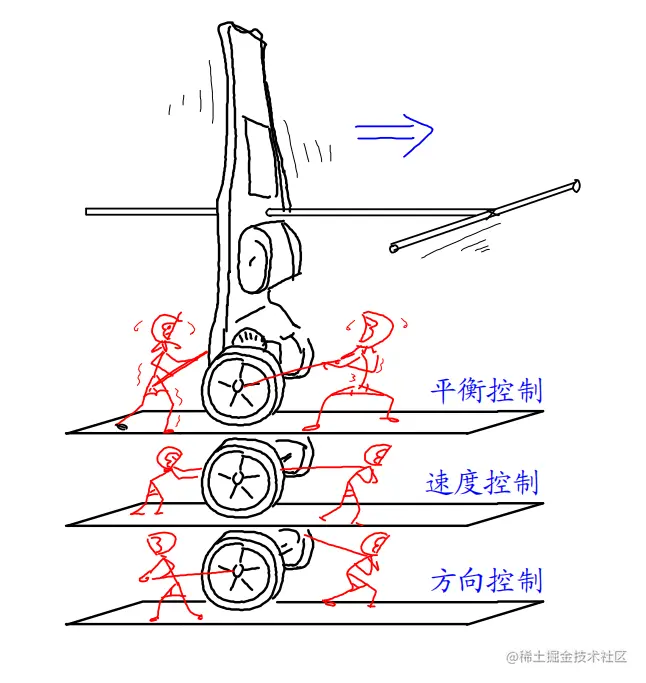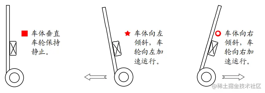 当木杆向前倾斜时,我们会往前行走,以用来抵消木杆的前倾;往后倾斜时,我们会往后倒退。对的!没错!你猜对了。平衡车的控制原理就是这样: