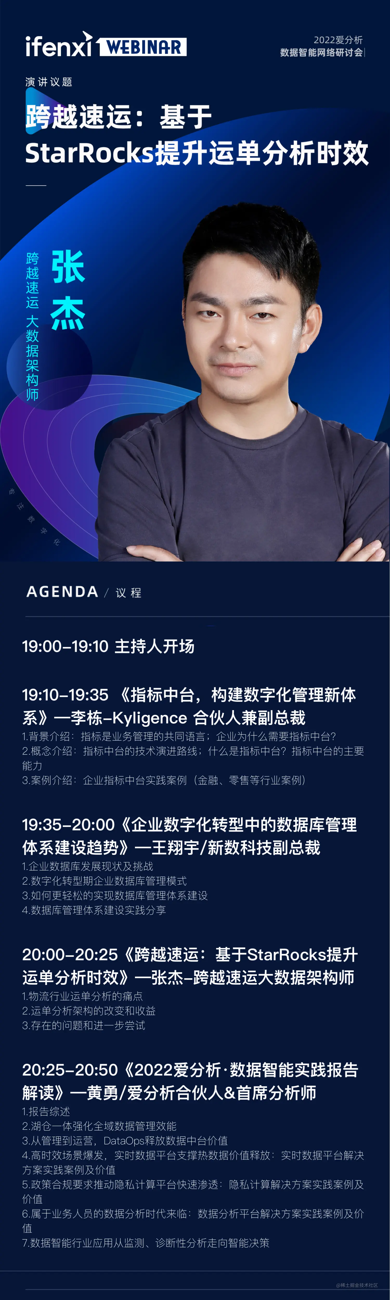直播 | 数据智能大咖在线研讨,带你找到适合自己的企业级方法论! StarRocks_labs 2022-12-16 37 阅读1分钟 企业机构如何评估自身数智化建设现状? 企业实现数据智能需要系统解决哪些问题? 如何针对性做好数据全链路规划和建设? 业内有哪些领先的实践和方法论? 12 月 20 日 19 点,作为物流行业数智化建设的代表,StarRocks 的老用户跨越速运受邀出席由爱分析举办的年度数据智能网络研讨会,与业内的厂商代表、分析师大咖共同探讨。 StarRocks 视频号将会同步直播本场研讨会,快快戳上方按钮预约! 扫码添加小助手 会后领取嘉宾 PPT 合集 + 直播回放!