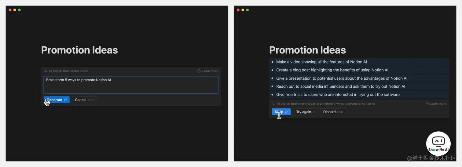 使用 Notion 创建新页面时,除了 Empty page(空白页面)外,还包括 Blog post(博客文章)、Brainstorm ideas(头脑风暴)、Pros and cons list(优缺点列表)等候选项。我们点击 Brainstorm ideas 输入文本提示后,Notion 就开始生成候选 ideas,喜欢可以选择保留,不喜欢可以更新提示后进行重试。整体使用体验很酷炫!