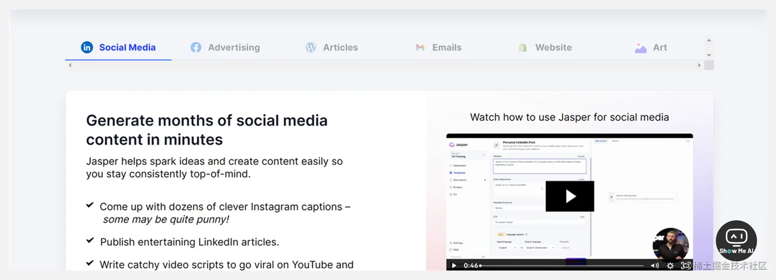 同样是基于 GPT-3 技术的写作软件,Jasper 提供了面向企业团队的 AI 写作助手,覆盖社交媒体po文、广告文案,往来邮件、网站展示、图片绘制等商业场景,大大提升团队的工作效率。在内容营销大行其道的当下,Jasper 将 AI 技术的爆发力迅速带入了内容营销的商业领域,既快速生成了可用的文案稿件,又避免了侵权风险。