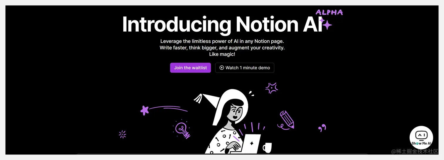 Notion 是一款将笔记、知识库和任务管理整合的协作工具,高效又美观,高效被用户称为“来自未来的笔记协作工具”。Notion 基于 OpenAI 的 GPT-3 开源模型,推出了 Notion AI (Alpha) 是写作助手,包括根据文本提示生成博客/邮件/JD初稿、列出idea候选清单、修正拼写语法、为会议/文档做总结等功能,能够有效地节省时间,提升创造力。不过需要点击官网 Join the waitlist,等待官方邀请才可体验。