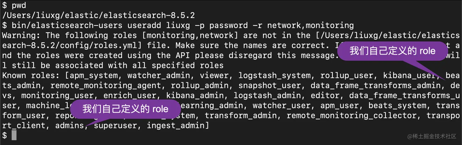 4. Warning: The following roles [monitoring,network] are not in the [/Users/liuxg/elastic/elasticsearch-8.5.2/config/roles.yml] file. Make sure the names are correct. If the names are correct and the roles were created using the API please disregard this message. Nonetheless the user will still be associated with all specified roles