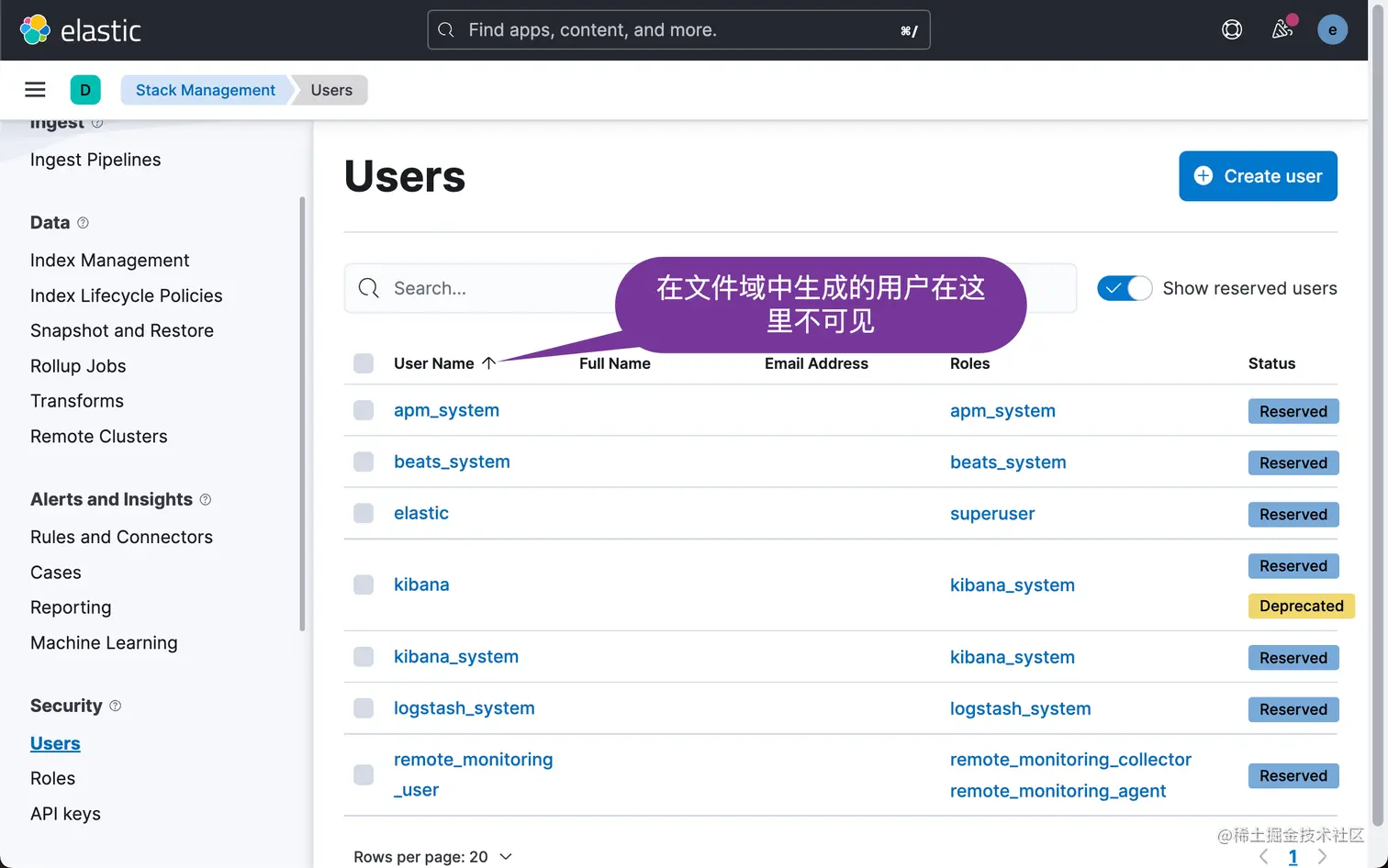 重要:作为集群的管理员,你有责任确保在集群中的每个节点上定义相同的用户。 Elastic Stack 安全功能不提供任何机制来保证这一点。 你还应该知道,你不能通过 user APIs 在文件域中添加或管理用户,也不能在 Management/Security/Users 页面上的 Kibana 中添加或管理它们。
