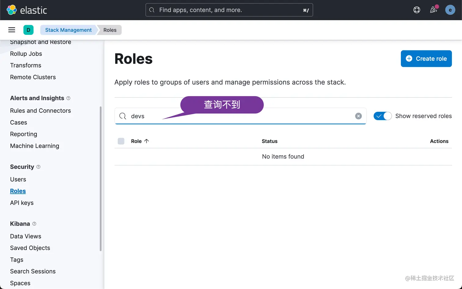 配置完后,我们重新 Elasticsearch。就像文章开头说的那样,我们通过这样的方法创建的 roles 并不能在 Management/Security/Role 中看到: