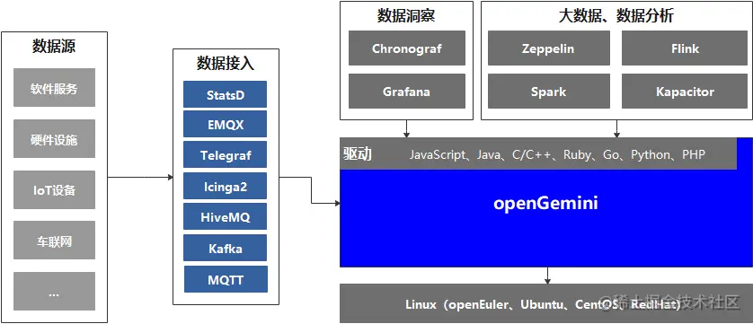 openGemini兼容InfluxDB API,因此InfluxDB支持1.x版本的工具链可以直接与openGemini对接。openGemini生态图谱如下图所示: