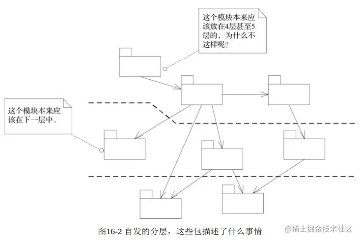 开发人员提出了不同的打包方案。有一些文档给出了系统的全貌,还有一些使用建模工具绘制的类图一一新视图可以用来指引开发人员找到正确的模块。但项目领导者对这些小花招并不满意。