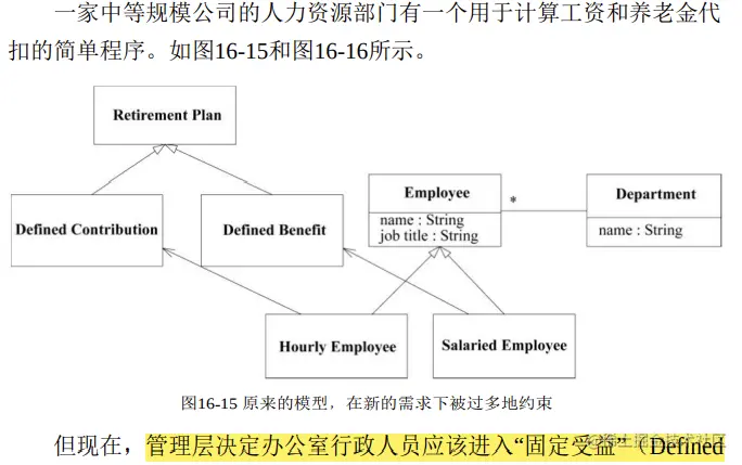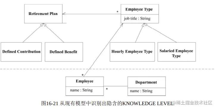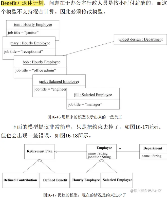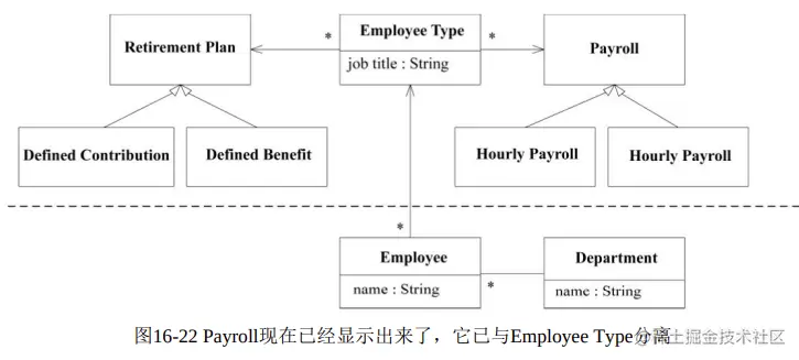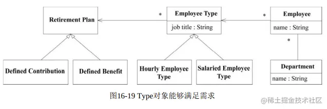 办公室行政人员按小时付薪酬,且采用固定受益退休计划。这个策略暗示出job title(工作头衔)字段现在表示了一个重要的领域概念。开发人员可以重构模型,用Employee Type(员工类型)把这个概念明确显示出来,如图16-19和图16-20所示。