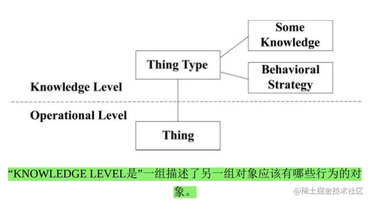 KNOWLEDGE LEVEL 是一组描述了另一组对象应该有哪些行为的现象。它并不像其他分析模式那样对领域进行建模,而是用来构造模型的。