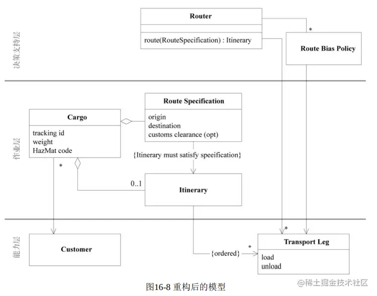 决策支持层可以为用户提供用于制定计划和决策的工具。Router 是一个 SERVICE,能帮助选择运送货物的最佳路线,因此属于决策支持层。原先在 Transport Leg 中的 is preferred 属性是因为公司希望优先使用自己的货轮,当 Router 选择最佳路线时会用到这个属性,因此它与能力层毫无关系,所以最终被重构到了 Route Bias Policy 中。