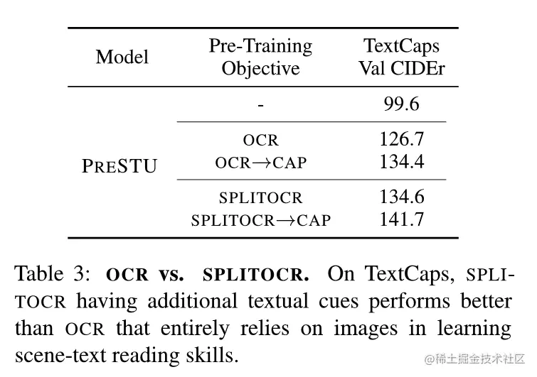 1. 对比SPLITOCR目标与传统OCR目标(TextCaps CIDEr指标):如表,SPLITOCR比OCR预训练的模型结果高,由126.7提升到134.6;