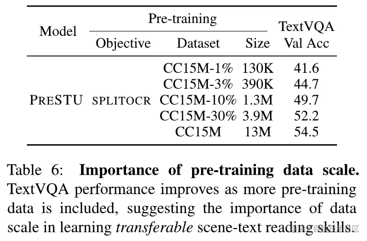 4. 预训练的数据规模:如表,数据规模越大,结果越好。