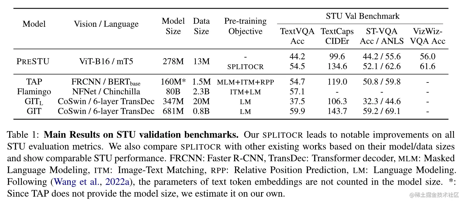 实验采用4个benchmarks:TextVQA (Singh et al., 2019) 、ST-VQA (Biten et al., 2019) 、VizWiz-VQA (Gurari et al., 2018) 、TextCaps (Sidorov et al., 2020) 。实验Baseline采用去掉SPLITOCR预训练的本模型PreSTU,同时也对比了以下预训练方法:TAP (Yang et al., 2021) 、Flamingo (Alayrac et al., 2022) 、GIT (Wang et al., 2022a) 。实验结果如表所示。