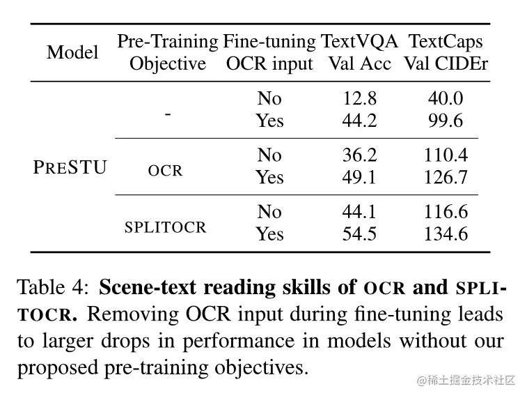 2. 在Fine-tuning阶段去掉输入的OCR文本:如表,去掉OCR文本后,各模型都有下降,但baseline模型结果下降更多。OCR/SPLITOCR预训练的模型即便Finetune时不使用OCR文本,结果也比baseline高(116.6/110.4 > 99.6)。这说明SPLITOCR预训练目标能够很好的使模型获得场景文本的阅读能力。