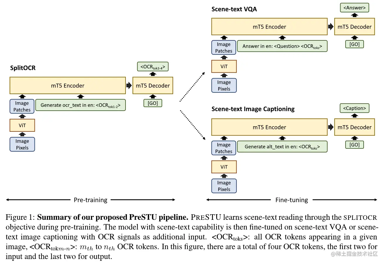 在真实世界中的视觉语言任务中,有大量的图像是包含场景文本的。理解图像中的文本对于视觉语言任务来说,往往是重要的,例如发票识别整理、机器人理解环境等。而现有模型经常忽略这一信息。通过对图像OCR信号引入,可以提升视觉语言模型对图像的理解能力。论文基于大规模的图像文本数据集,设计了进行场景文本理解的预训练模型PreSTU。
