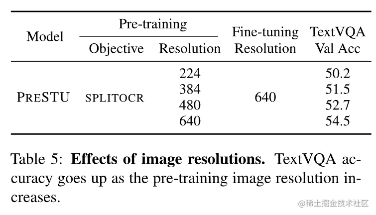2. 对于PreSTU模型来说,预训练图像的分辨率以及数据量很重要。