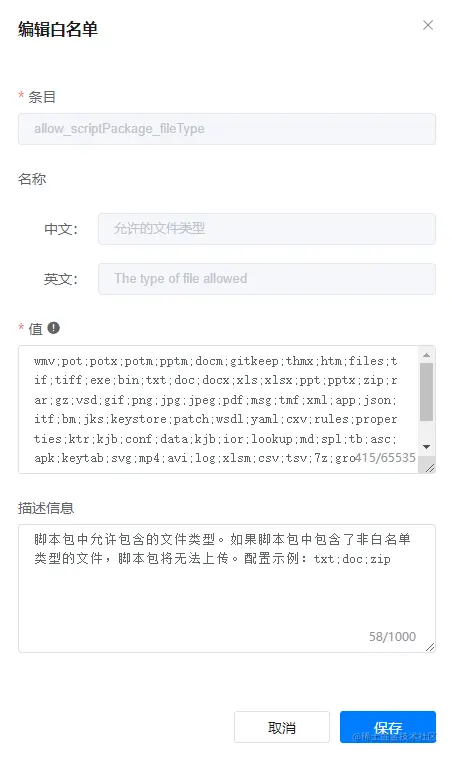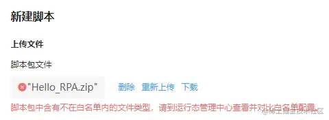 如果项目中包含jar包文件,在管理中心上传脚本时会触发文件类型的白名单检查,如果未配置jar包中的相关文件类型,那么就无法通过白名单检查,从而管理中心上传脚本失败。