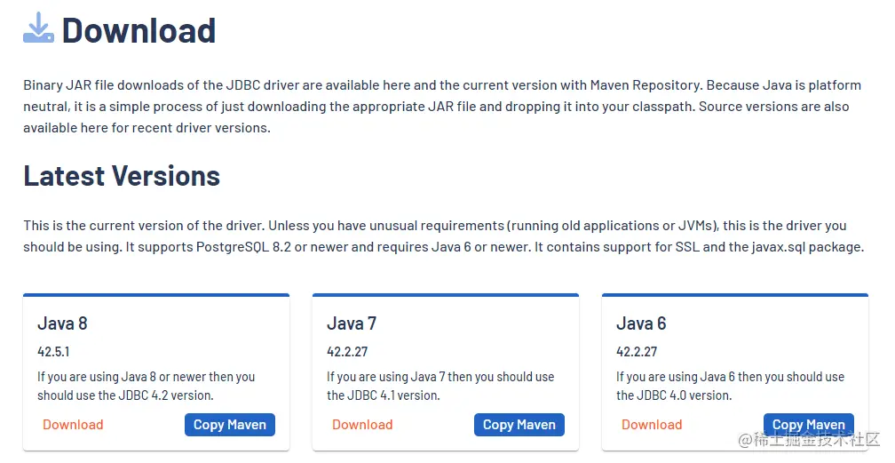 jdbc.postgresql.org/download/ 选择合适的版本点击下载即可