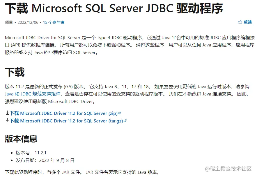 learn.microsoft.com/zh-cn/sql/c… tar.gz格式的压缩包适合在Linux系统解压,zip格式的压缩包适合在Windows系统解压,下载此驱动程序时,有多个 JAR 文件。 JAR 文件名表示它支持的 Java 版本,选择合适的版本使用