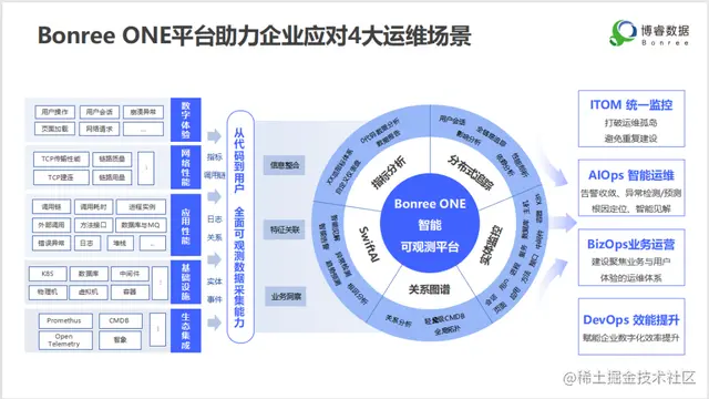 作为国内首个真正实现智能运维的一体化智能可观测性平台。Bonree ONE 2.0具备全球竞争力的产品特性,它集成数据一体化采集与分析处理,运用自动化与人工智能技术,自动发现业务系统、应用、服务与资源之间的关联关系,真正实现从用户到基础设施全栈、全链路、全场景数据可观测,并统一数据规范,从时间和空间上建立起IT运维监控数据关联性,进一步利用AI智能预测故障来主动发现系统问题、提出见解、定位根因,显著提升IT运维的能力和效率。