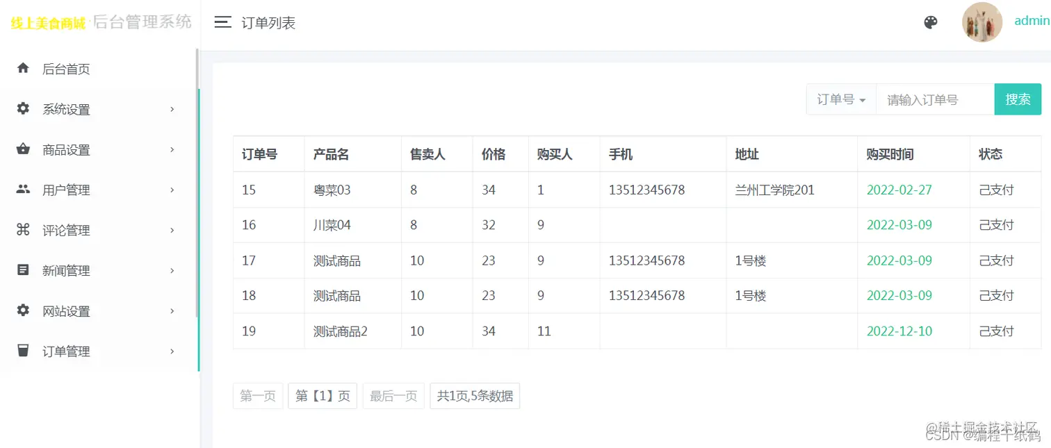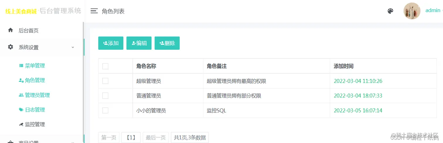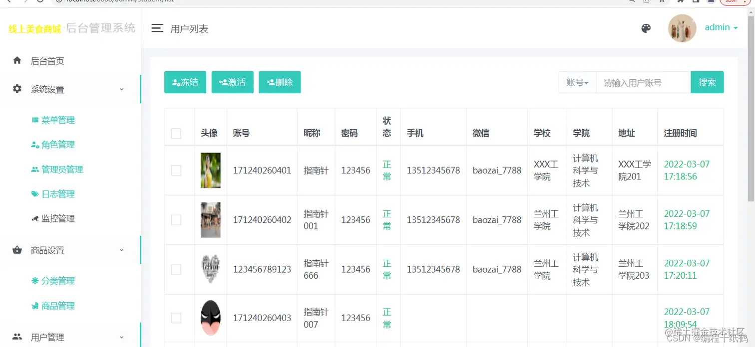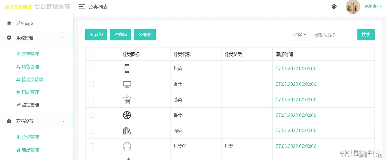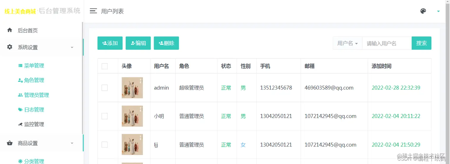 管理员用户登陆系统后台,主要进行用户管理,商品类型管理,商品管理,订单管理,评论管理,系统管理,角色管理,权限管理,日志管理等相关功能模块。