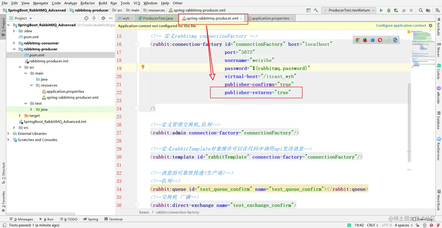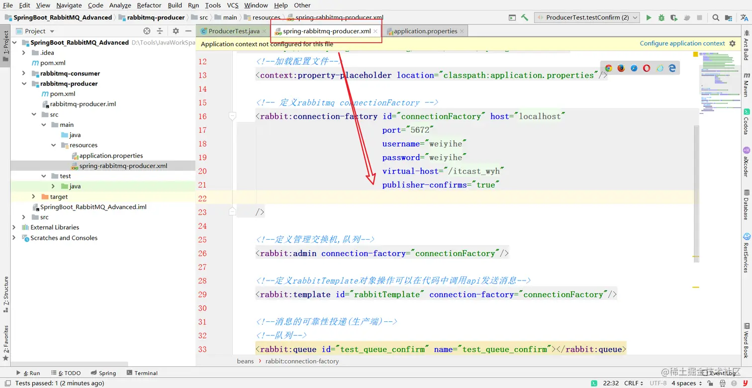 1确认模式的开启:在connectionFactory中开启,默认是false不开启的 publisher-confirms="true"