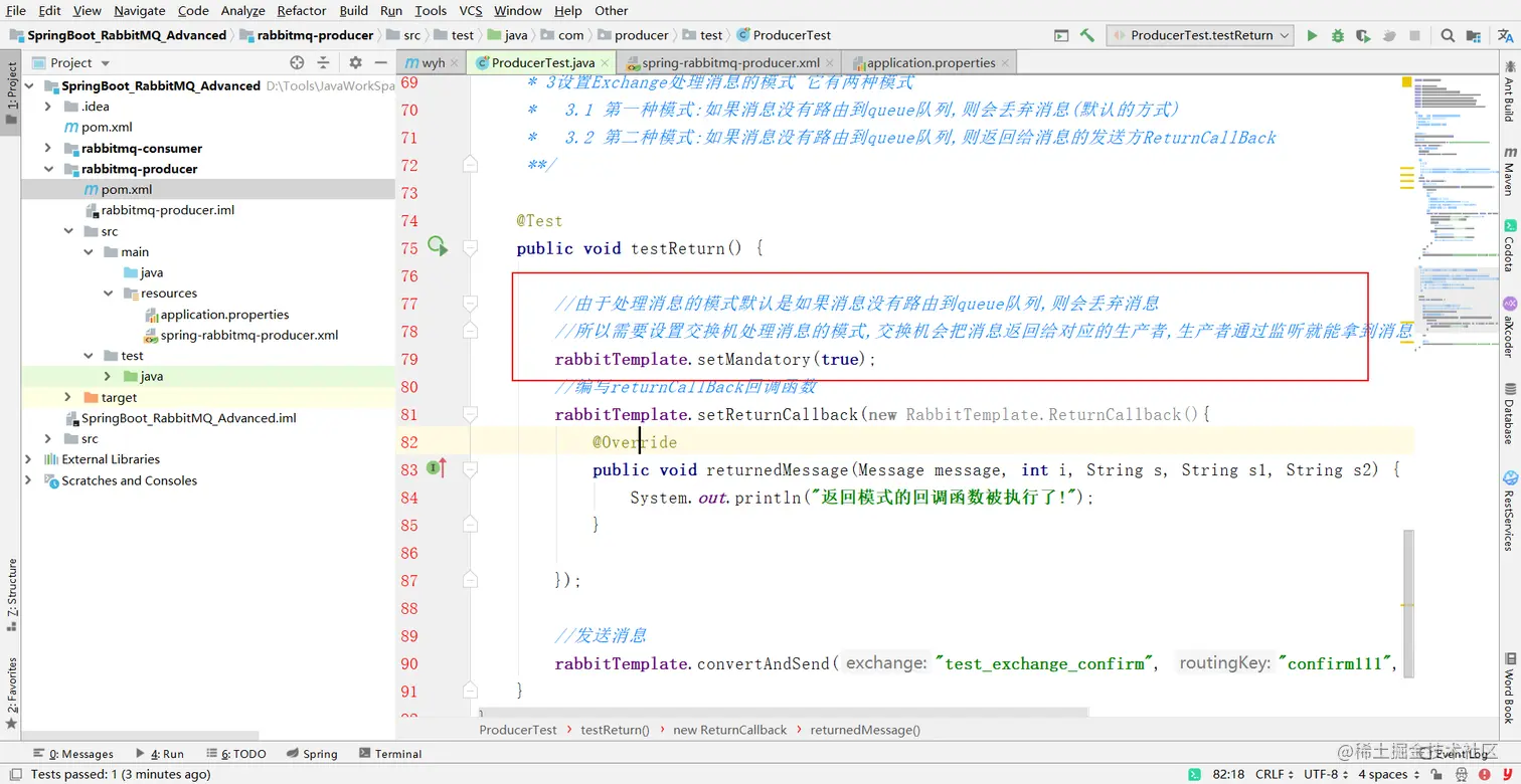 2 使用rabbitTemplate.setReturnCallBack()设置回调函数,当消息从exchange路由到queue失败后,如果设置了rabbitTemplate.setMandatory(true);则会将消息退回给producer,并执行回调函数returnedMessage