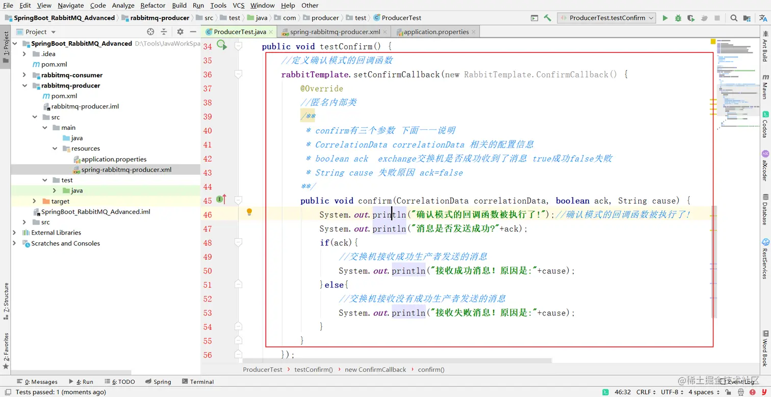 2回调函数的编写:在RabbitTemplate模板工具类定义ConfirmCallBack(回调函数).当消息发送出去的时候回调函数会自动执行,返回true(成功)或者false(失败)