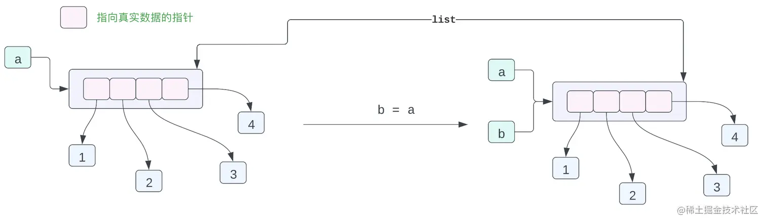 变量 a 指向内存当中的列表 [1, 2, 3, 4],列表当中有 4 个数据,这四个数据都是指针,而这四个指针指向内存当中 1,2,3,4 这四个数据。可能你会有疑问,这不是有问题吗?都是整型数据为什么不直接在列表当中存放整型数据,为啥还要加一个指针,再指向这个数据呢?