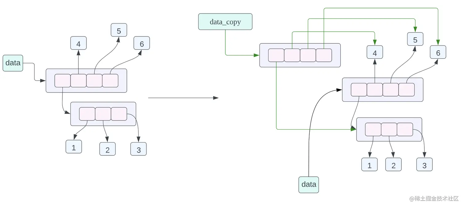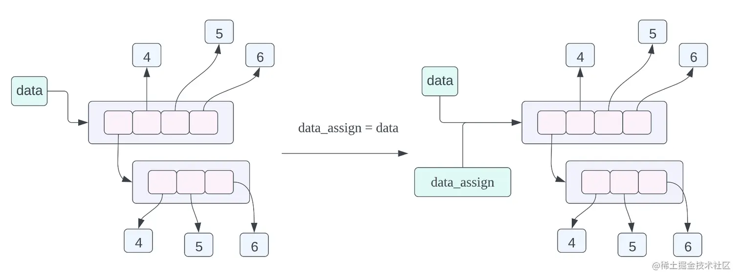 看到这里你肯定会非常疑惑,为什么深拷贝和浅拷贝指向的内存对象是一样的呢?前列我们可以理解,因为浅拷贝拷贝的是引用,因此他们指向的对象是同一个,但是为什么深拷贝之后指向的内存对象和浅拷贝也是一样的呢?这正是因为列表当中的数据是整型数据,他是一个不可变对象,如果对 data 或者 data_copy 指向的对象进行修改,那么将会指向一个新的对象并不会直接修改原来的对象,因此对于不可变对象其实是不用开辟一块新的内存空间在重新赋值的,因为这块内存中的对象是不会发生改变的。