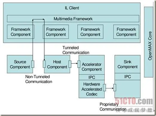 - 客户端(Client):访问IL core或IL component的软件层,可能是位于GUI应用程序的下层,如GStreamer。IL client是一个典型的功能块,如filter graph multimedia framework, OpenMAX AL, 或application都可以调用它。IL client与OpenMAX IL core进行交互,利用IL core加载和卸载组件、在组件间建立直接通信以及获得组件方法的入口。